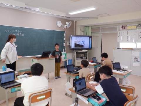 スーパーマーケットのひみつ発表会をしました。今日の発表も写真がたくさんあったり,わかったことをQ&Aでまとめたりとスーパーの工夫がよくわかりました。お客さんが利用しやすいようによく考えられていますね。