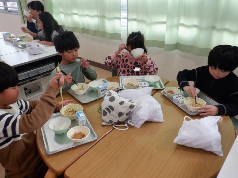 今日の給食は,ご飯,鶏肉のてり煮,小松菜の担々麺,牛乳でした。しっかり食べて,元気に過ごしましょう!