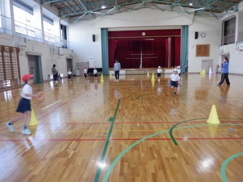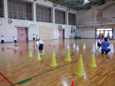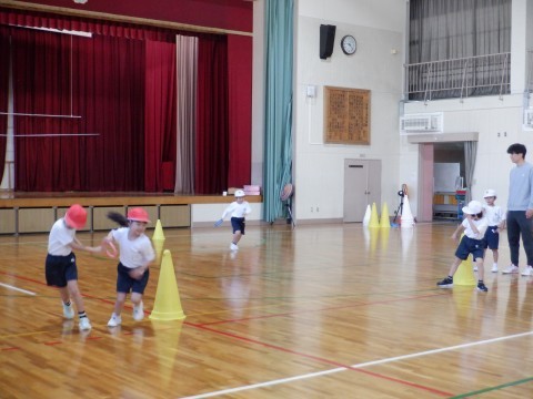 リズムよくジャンプしたり,バトンを使って友だちにパスしたりして,体をいっぱい動かしました。