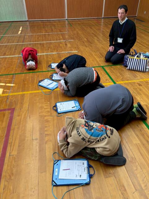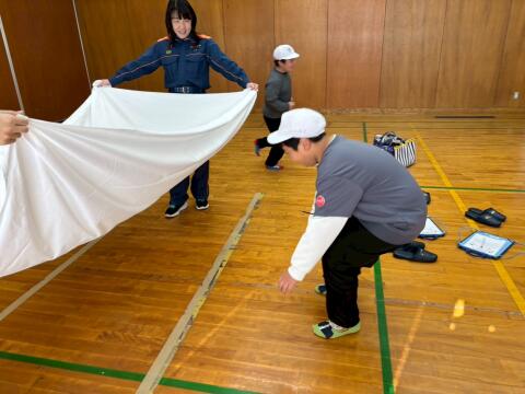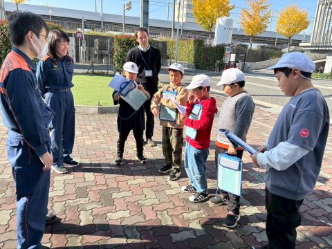 消防署に見学に行きました。はじめに、地震や火災のときの避難の仕方を教えてもらいました。