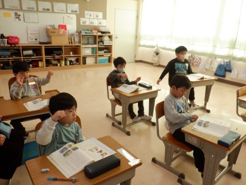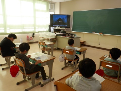 「たぬきの糸車」を読んで,お話のあらすじを話し合いました。糸車をまわす様子をやってみました。