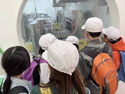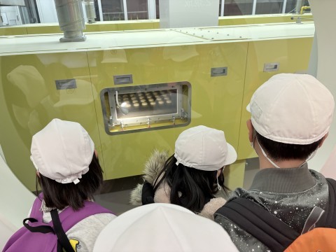 月化粧に関する動画を視聴した後、工場を見学しています。工場内には、月化粧の甘い匂いがしています。最後には、たった今出来上がったばかりの月化粧をいただきました。おいし〜い!と大絶賛でした。