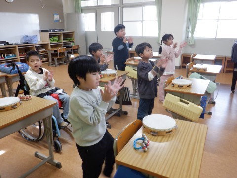 「あわてんぼうのサンタクロース」を歌いました。途中で,スズやタンバリンの楽器や手拍子を入れたりして,楽しく演奏しました。