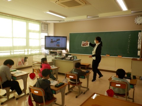 「せかいのこどもたち」の写真を見て,他の国の子どもたちの生活について考えました。似ているところ,違っているところを話し合いました。
