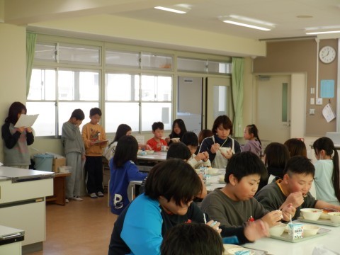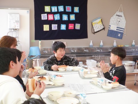 今日の給食は,コッペパン,クリーミーコーンの豆乳スープ,ガーリックポテト,チョコレートクリーム,牛乳でした。「国語のノートをたくさん書いていたよ」「漢字の練習を頑張っていたよ」と今日も「宮園っ子のいいね」の発表とキッザニアクイズがありました。