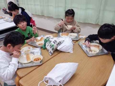 今日の献立は,ミニバン,あげパン,春雨とうずら卵のスープ,肉団子のケチャップ煮,牛乳でした。3学期最初の給食でした。給食前から,大人気のあげパンを楽しみにしていました。