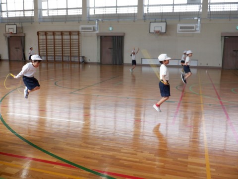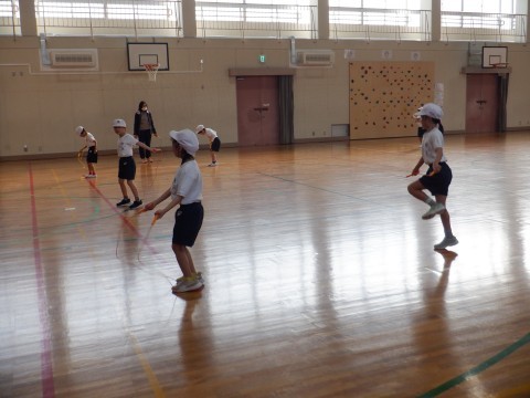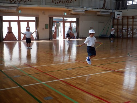 縄跳びをしました。前回り跳びでどれだけ続けて跳べるのか,競争しました。2年生は前回り跳び以外の技にも挑戦していました。