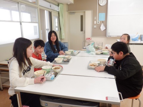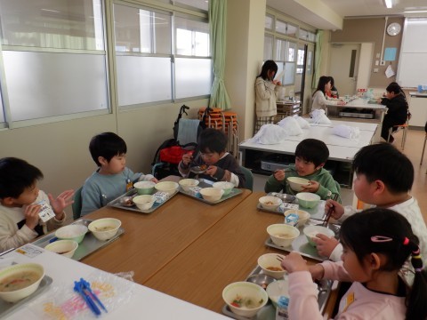 今日の給食は,ご飯,関西風雑煮,ぶりの照り焼き,にしめ,牛乳でした。お正月献立でした。お雑煮のお餅がおいしかったですね。