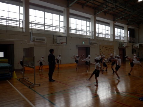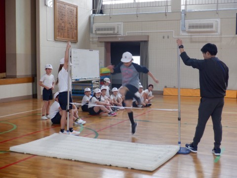 縄跳びと並行して,高跳びの活動をしています。今日は,踏切の仕方や助走のリズムをみんなで確認し,練習しました。