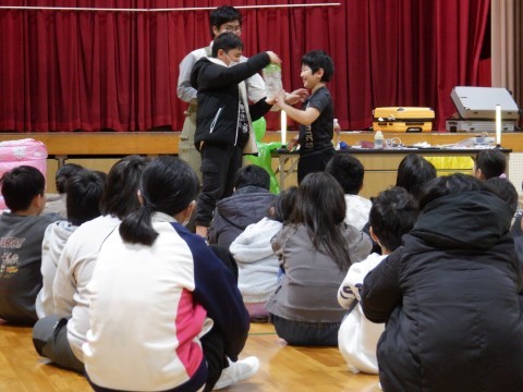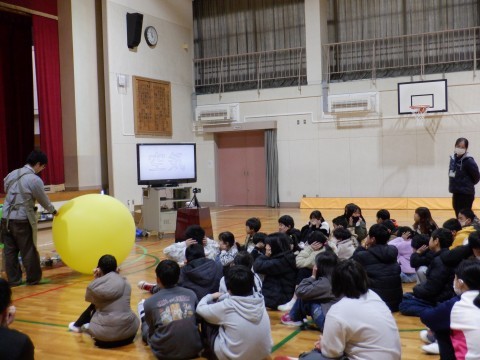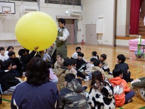 「楽しい実験のつくり方」を伝授していただきました。最初に見せていただいたお茶の実験をさせてもらいました。また空気の重さを感じるために,大きな風船を触らせてもらったりしました。