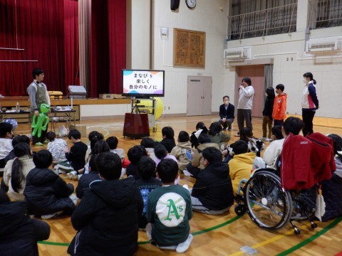 空気砲で空気の動きをよくわかるように見せてもらいました。できた「輪」をよく観察してみたら,くるくるまわっていました。気付いたことを伝えることが大切なんですね。最後に授業をしてくださった先生に「なぜ理科が好きになったのですか」と質問したり,児童会のみんなが感想を言ったりしました。今日の理科の楽しい実験授業は,普段の理科の授業の内容を使ったり,発展させたりしたものです。普段の理科の学習やその他の教科の学習から,少しでも「不思議だな」「おもしろいな」と興味・関心をもち,楽しく学べるものを見つけてほしいと思います。
