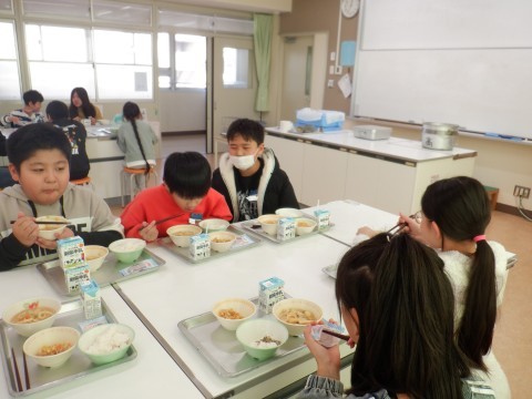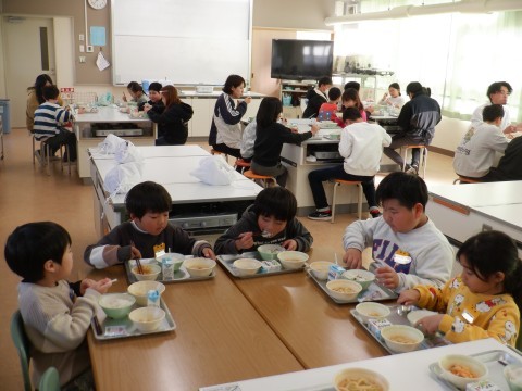 給食の時間 公開日 2026/01/19 更新日 2026/01/19 学校紹介 今日の給食は,ご飯,味噌煮込みうどん,大根の塩こうじ和え,小魚の佃煮,牛乳でした。冬は温かいうどんがおいしかったですね。