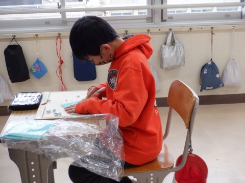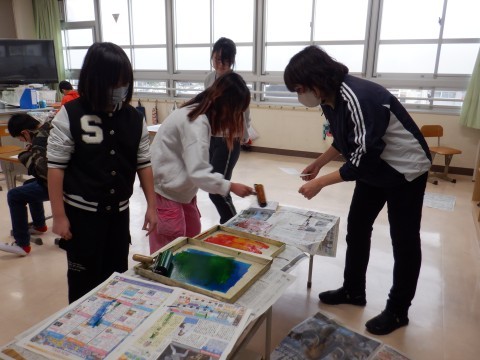 6枚の版ができた人から順番に,インクをつけて版画をしました。「どの色にしようかな」とそのままの色や混ぜ合わせた色で刷っていました。版画は味わい深い色がでますね。