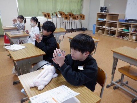 2年生 音楽 公開日 2026/01/26 更新日 2026/01/26 2年 自分たちで考えたリズムを組み合わせて,カスタネットで叩きました。難しいリズムにもすぐに慣れ,上手にリズム打ちができていました。