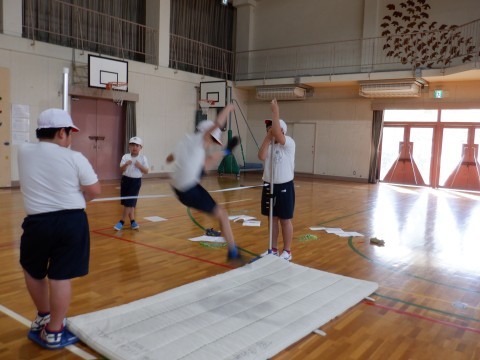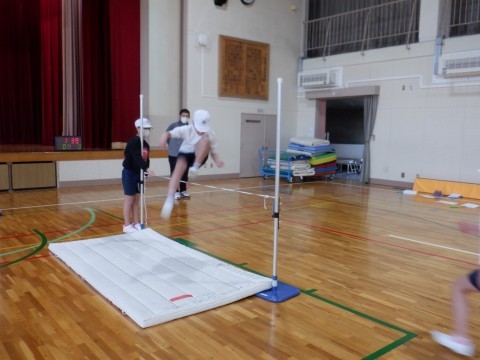 高跳びをしました。「イチ・ニ・サーン」と声をかけ合いながら練習していました。
