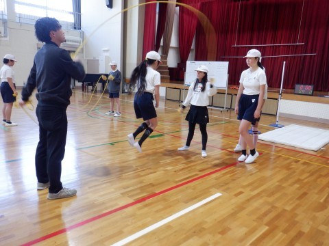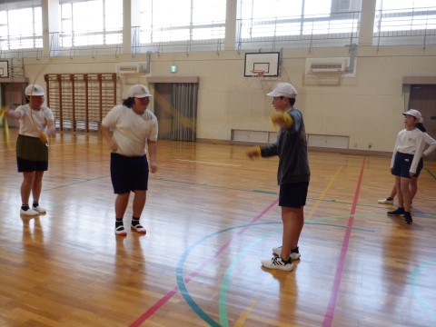 ダブルダッチをしました。「入って,跳んで,出る」ができるようになった人もいました。「はじめは全然できなかったけど,少し跳べるようになった」とできるようになったことをふりかえっていました。跳べるようになると楽しいですね。あきらめず練習して,楽しさを増やしていきましょう!