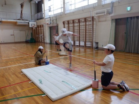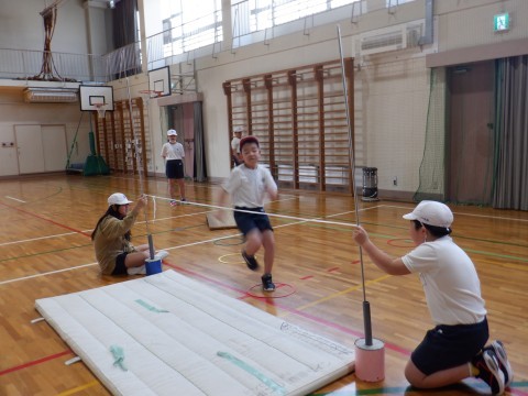「イチ,ニ,イチニサーン」と声を出して,リズムを確認しながら練習していました。「はじめの頃に比べると,ずいぶん高く跳べてきたね」と先生にほめてもらっていました。