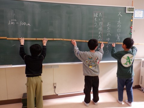 1メートルものさしを使って,長い長さを測りました。