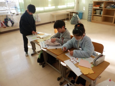 今日も紙版画づくりの続きをしました。ギザギザやポコポコの材料をどこに置くのかよく考えて,作っていました。