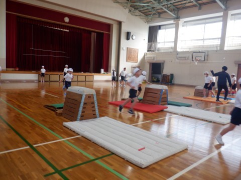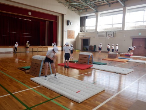 跳び箱で開脚跳びを練習しています。技の最後まで美しい演技をめざして練習していきましょう!
