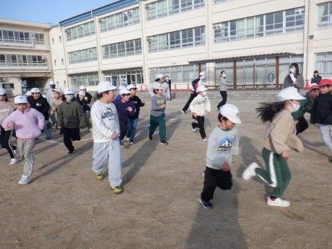〇△□鬼をしました。鬼が「三角」というと,△が描かれた枠内に入ります。枠の外で鬼にタッチされると鬼になります。鬼が指定する形をめざして,走っていました。
