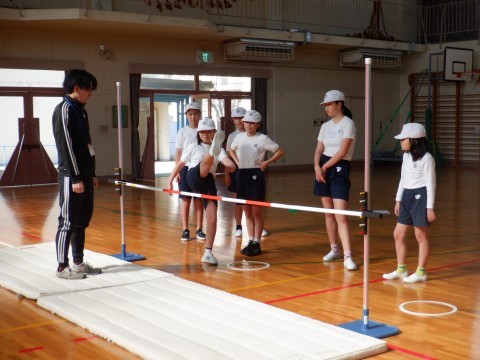 「高跳び」をしました。踏切で止まってしまう人が多く,足のあげ方を教えてもらっていました。きれいに跳べている友だちの様子をよく見てイメージし,思いきって踏切ができるといいですね。