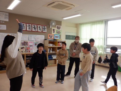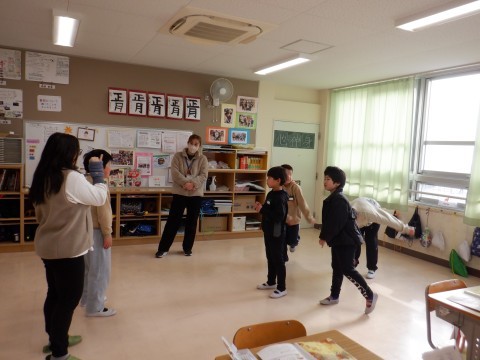 "Its yellow and black."と,色や形のヒントを聞いて,教室に貼っている動物を選ぶクイズをしました。どう言っていいのかわからない人も友だちに教えてもらって,クイズを出していました。