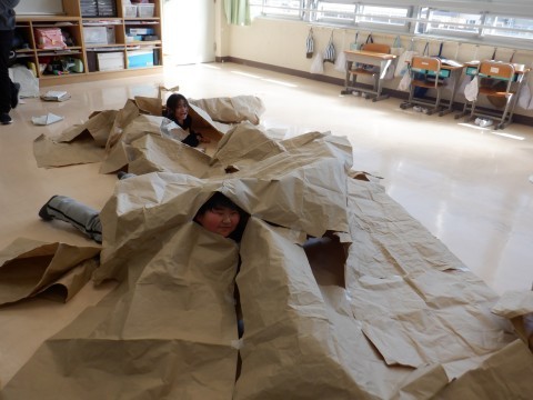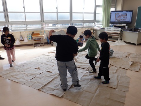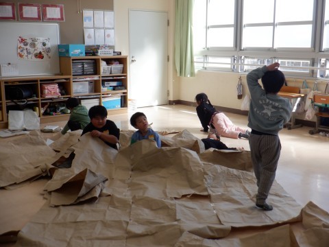 「だいすき!わくわくペーパー」の活動で大きな紙と遊びました。はじめに,大きな紙をテープでつないで,もっと大きな紙にしました。それから紙の下に入って,おうちのようになりました。