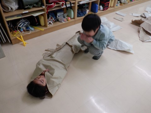 大きな紙のテープが外れてきたので,それぞれに変身グッズをつくったり,くるまったりして遊びました。いろいろな遊び方を楽しむことができましたね。
