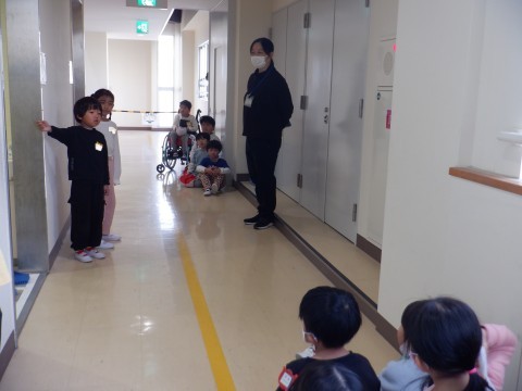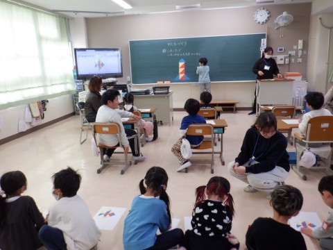 宮園こども園の年長さんが,学校の様子を見に来てくれました。はじめに,1年生の学習の様子を見て,色板で形づくりをしました。ロケットや魚の形を上手に作っていました。2時間目の学習の時間が終わると,トイレや,保健室,昇降口,学校図書館と,学校にある施設を紹介しました。