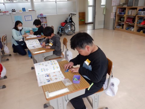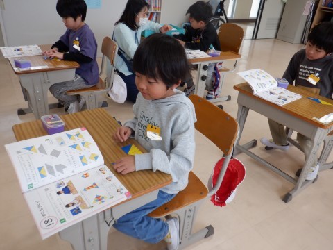 「かたちづくり」の学習で,4まいの色板で,教科書と同じ形を作りました。
