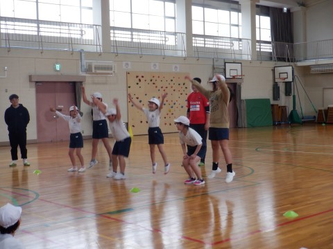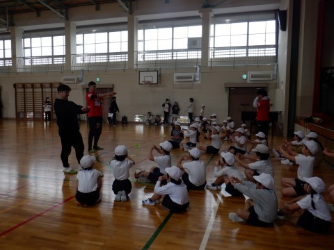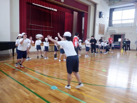 「おにぎりのかまえ」を教えてもらって,パスされたラグビーボールをキャッチするこつを教えてもらいました。先の人からのボールをキャッチして,走りました。
