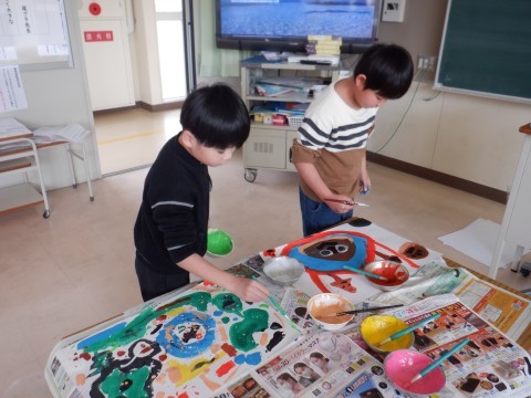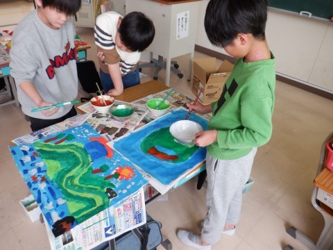 共同絵の具を使って,「えのぐじま」を描きました。限られた色の絵の具と太筆を使って,ダイナミックに描いていました。