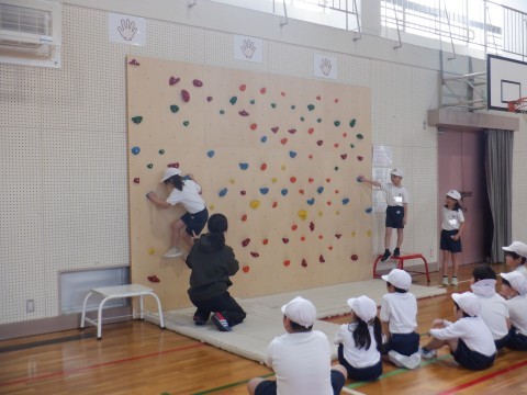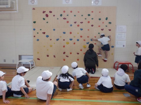 ボルダリィングをしました。マットに落ちることなく進むことは難しかったようですが,よく考えて活動していました。