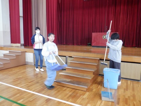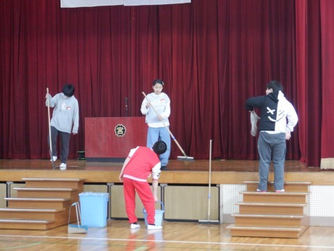 奉仕活動として,体育館の掃除をしてくれました。舞台の上をほうきで掃いて水拭きしたり,体育館の床をモップで拭いたりしてくれました。お別れ式や卒業式を気持ちよく迎えられますね。