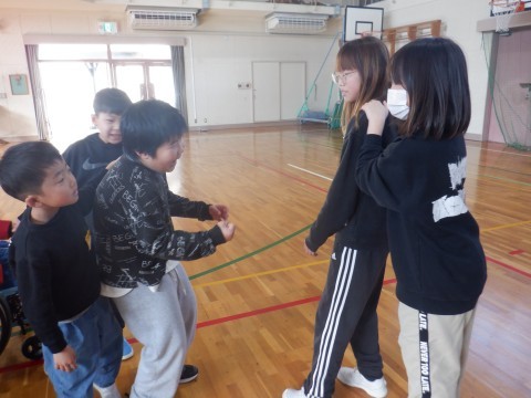 「最初はグー,ジャンケンほい!」はじめに,みんなで「じゃんけん列車」をしました。最後は5年生が勝ち残り,先頭になって1本の長い列車ができました。