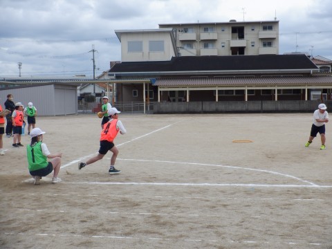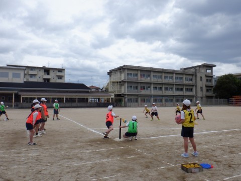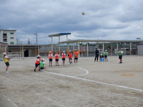 ハンドベースボールをしました。「アウト!」と今日も元気な声が響いていました。
