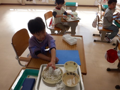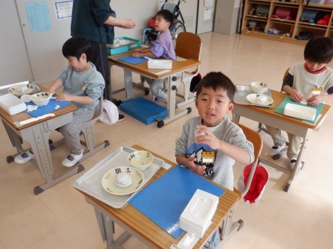 「あったらいいな,こんな給食」をテーマに,食べてみたい給食を粘土でつくりました。ラーメンや豚まんなど,楽しんでつくっていました。