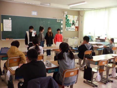 「生活調査隊」の活動でクラスの友だちにアンケートを取って調べたことを発表しました。話し方に強弱をつけたり,グラフの資料をつくったりして,わかりやすく伝えようと工夫して発表していました。