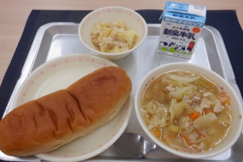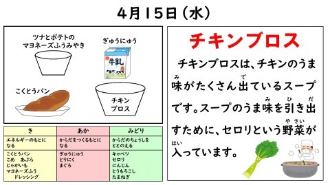 今日の献立は,チキンブロス,ツナとポテトのマヨネーズふうみやき,こくとうパン,牛乳です。