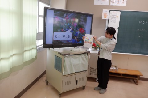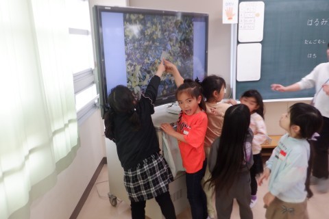 「春(はる)みつけ」のふりかえりをしています。目で見たり,さわってみたり,においをかいだり,音を聞いたりしてみつけた春を共有しています。
