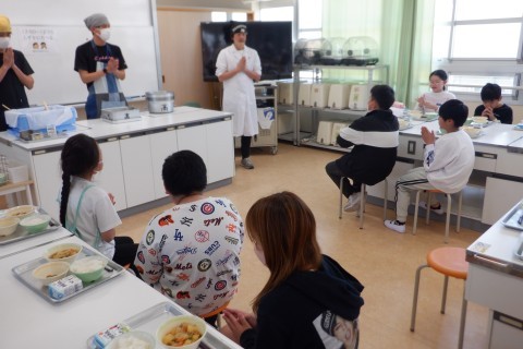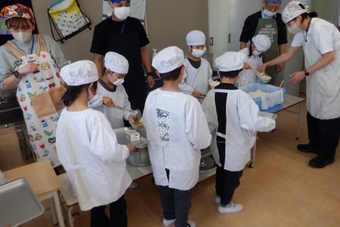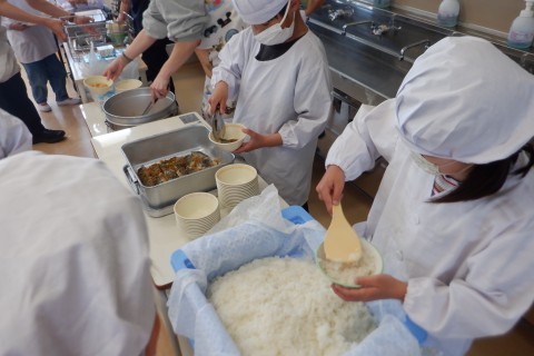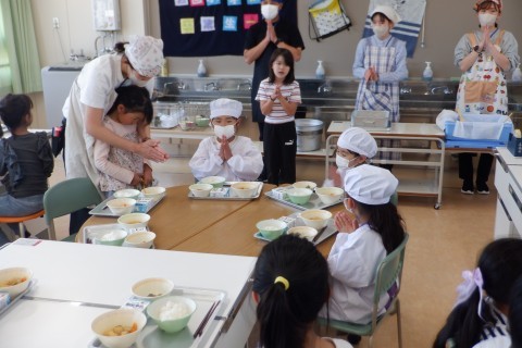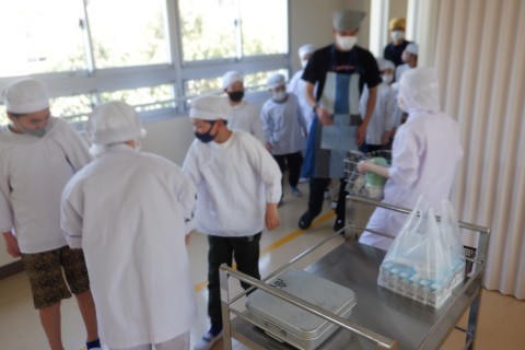 みんなで力を合わせて,てきぱきと給食の準備をします。準備ができたら手を合わせて「いただきまーす!」