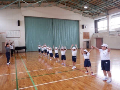 堺っ子体操を先生のお手本を見ながら練習しました。とても上手に体を動かすことができ,先生にほめてもらってうれしそうでしたよ。