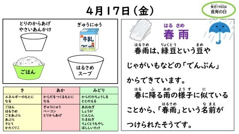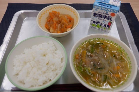 今日の献立は,はるさめスープ,とりのからあげやさいあんかけ,ごはん,牛乳です。