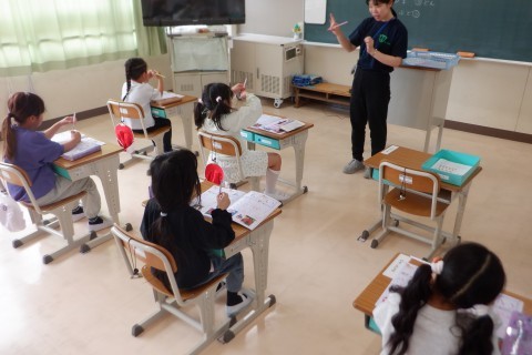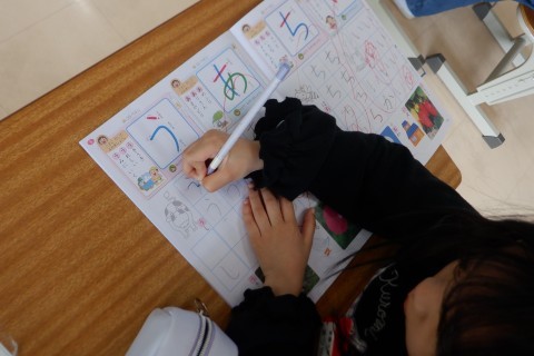 ひらがなの練習。今日は「うさぎ」「うし」…の「う」です。先週の「あ」とくらべると書きやすそうですね。