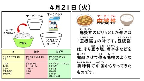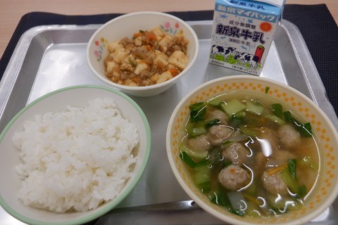 今日の献立は,にくだんごスープ,マーボーどん,ごはん,牛乳です。
