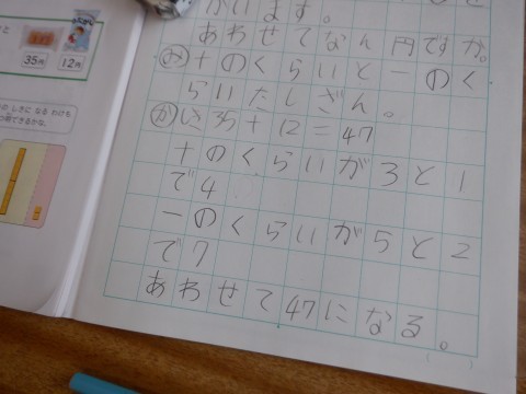 「あわせてだからたしざんになるとおもう。」「十の位と一の位を・・・」と今までの学習をいかして考えることができていました。