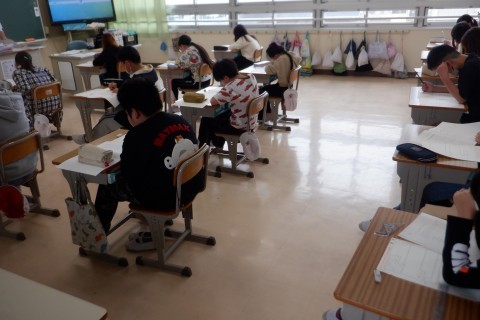 2時間目は,1つの教室で,5年生がすくすくウォッチ,6年生が全国学習調査に同時に取り組んでいます。全員真剣です!