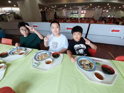お昼の中華丼とアイスクリームを食べて、いよいよ小学校に向けて、出発します!