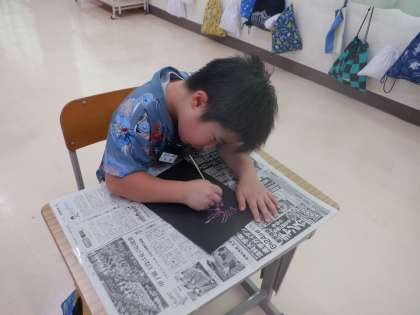黒色のクレパスを削ると・・・スクラッチをして、花火の様子を描きました。